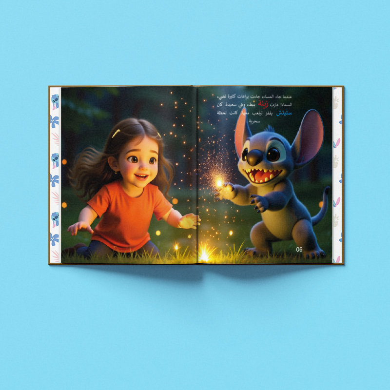تعيش طفلتك زينة مغامرة دافئة ومليئة بالمشاعر، حيث ترى اسمها وصورتها في كل صفحة، وترافق شخصية لطيفة اسمها ستيتش في رحلة تعلمها معنى الصداقة والوفاء بالعهد. هذه القصة ليست مجرد حكاية، بل تجربة شخصية تجعل الطفل يشعر بأنه بطل القصة الحقيقي، فيتعلّق بها ويعيش أحداثها بقلبه قبل عينيه، بأسلوب قريب من وجدان الأمهات ويزرع الطمأنينة في نفوس الصغار.